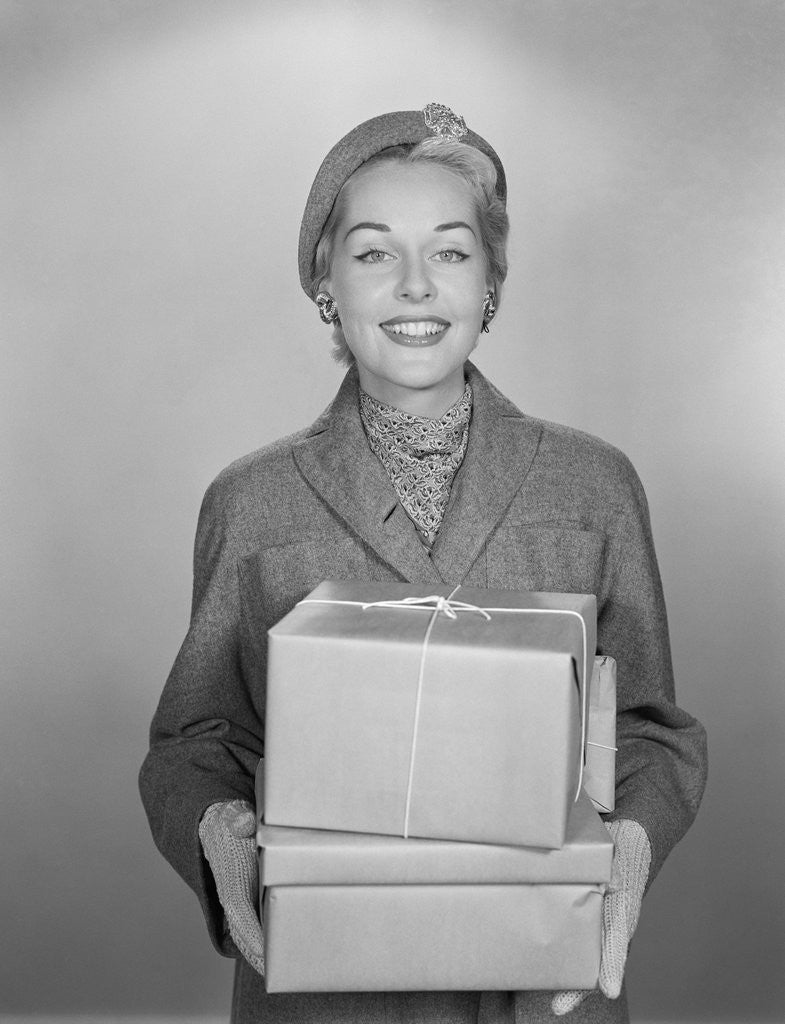 Product images of Fashionably dressed woman holding packages wrapped in brown paper and string