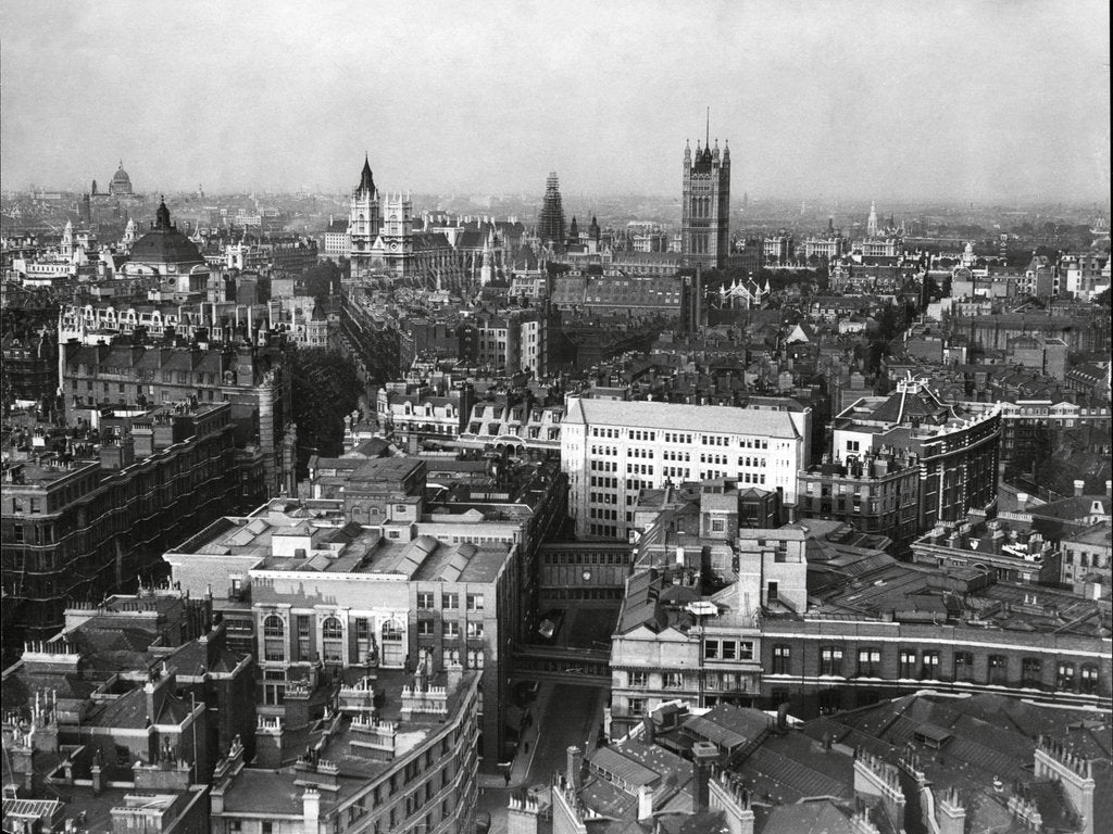 Aerial view of London taken from the campanile of Westminster Cathedral in 1929; Westminster Abbey, Central Hall Westminster, St Margarets Westminster and St Paul's Cathedral in the distance