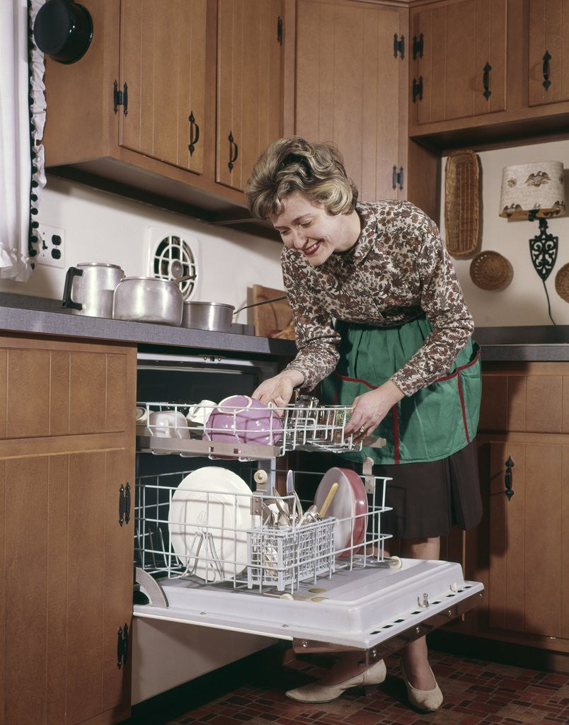 Product details 1960s Smiling Woman Apron Bending Over Emptying Dishwasher In Kitchen
