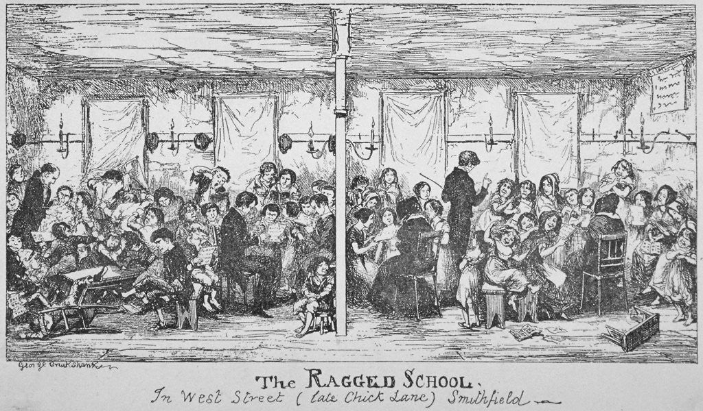 Field Lane Ragged School, Smithfield, City of London, 1850. Interior view of the Field Lane Ragged School showing adults attempting to teach a group of disorderly children.