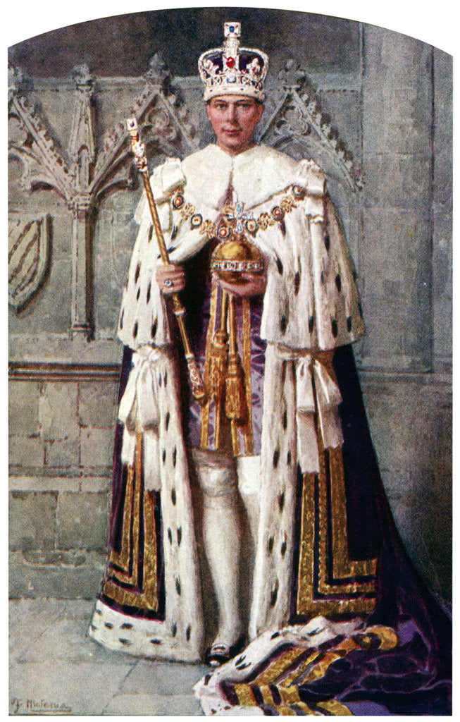 George VI in coronation robes: the Robe of Purple Velvet, with the Imperial State Crown