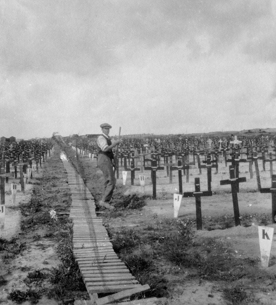 Hooge Crater Cemetery, near Ypres, Belgium, World War I, c1917-c1918. Hooge is a village that was located within the Ypres salient during the First World War. A large crater was formed when the British Army detonated a huge mine in 1915. Craters were strategically important in the flat countryside and the one at Hooge was bitterly fought over, changing hands several times. The graves of 5924 British and Commonwealth soldiers are in the cemetery, which was begun in 1917. Stereoscopic card detail.