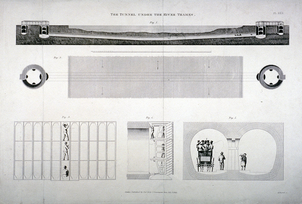 Plan, sections and elevations of the Thames Tunnel, London, 1835. The Thames Tunnel, connecting Wapping and Rotherhithe, was the first underwater tunnel in the world. Completed as a foot tunnel in 1843, it was converted to a railway tunnel for the East London Railway in the 1860s. Sir Marc Isambard Brunel designed the tunnel, and his son, Isambard Kingdom Brunel, was site engineer.
