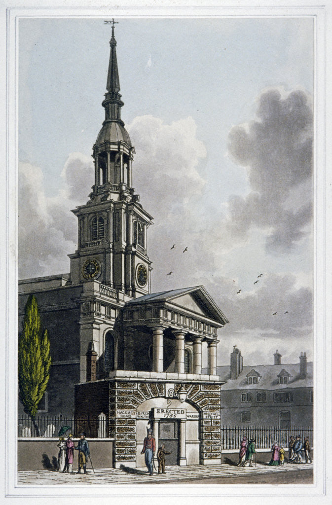 St Leonard's Church, Shoreditch, London, 1814. North-west view showing the watch house and figures in front.