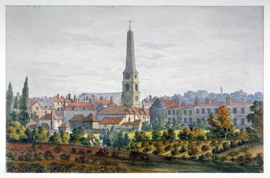 St Luke's Church, Old Street, Finsbury, London, c1810. Nicholas Hawksmoor designed the obelisk spire.
