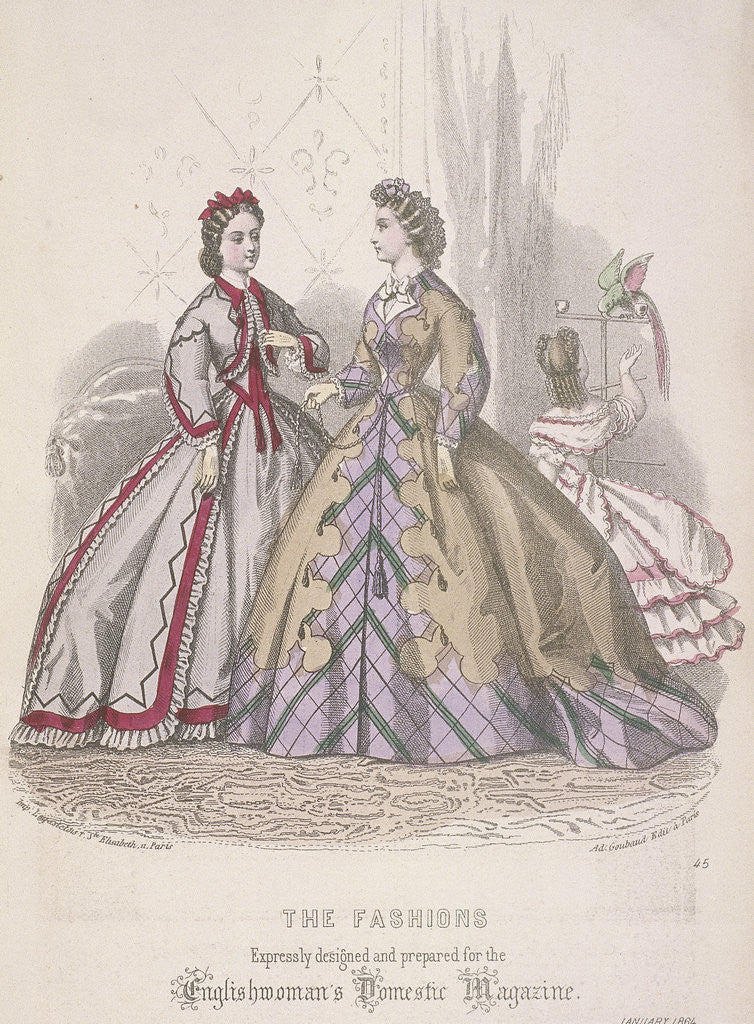 Product images of Two women and a child playing with a parrot model the latest fashions, 1864