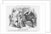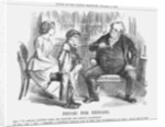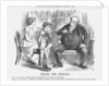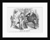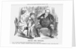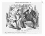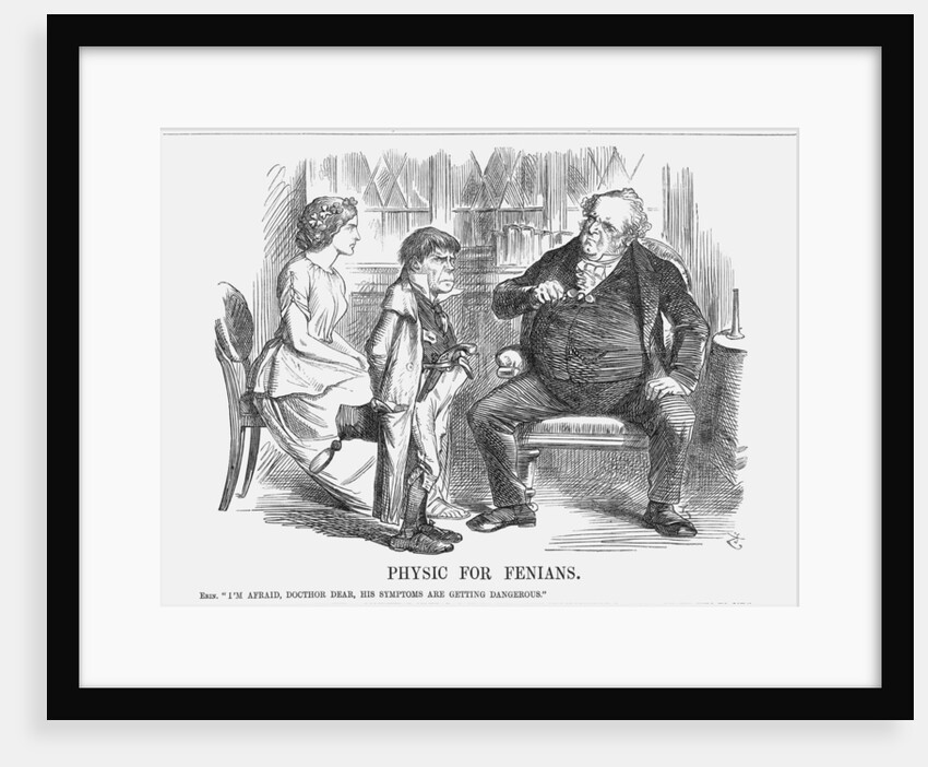 'Physic for Fenians', 1866. Erin, wearing shamrocks in her hair, has brought her little Fenian in to be examined by Dr Bull. Looking sternly at the mutinous boy, Dr Bull says that he treated a similar case in India. This refers to the Indian Uprising of 1857. He proposes to deal with the Fenian problem in exactly the same way. The Irish Fenian movement had begun to make its presence felt during the previous year. As the American Civil War came to a conclusion, money began to arrive from the United States to support the Fenians. Their aims were the separation of Ireland from Britain and the overthrow of the Queen's authority. From Punch, or the London Charivari, December 8, 1866.