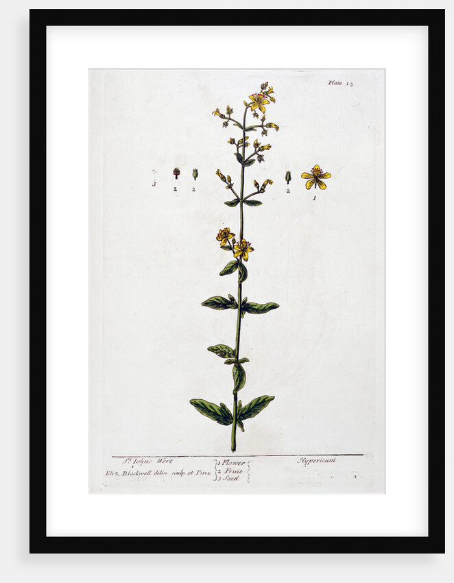 St John's Wort, 1782. Extract of this plant is used to treat depression and anxiety disorders. Plate 15 from A Curious Herbal by Elizabeth Blackwell, published in 1782.