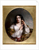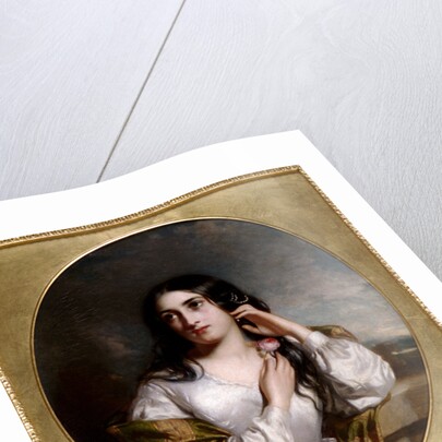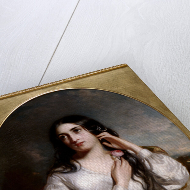 'The Fair Friend', c1840. A woman in white with long dark hair holds a flower. Her sultry looks don't reveal her mood; she may be missing a lover.