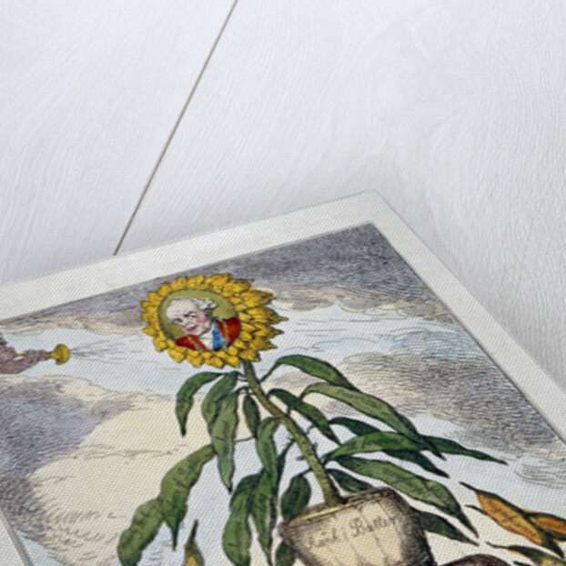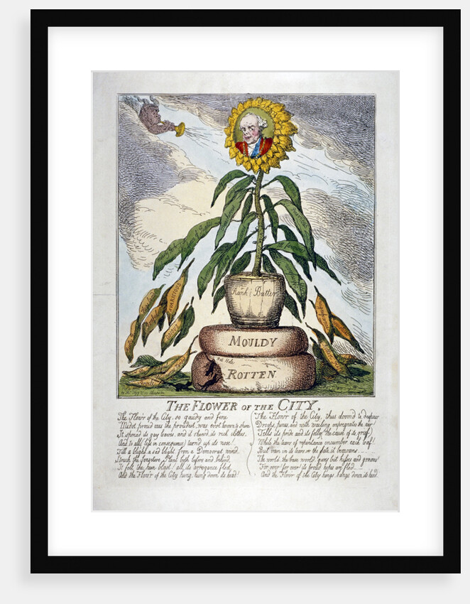 'The Flower of the City', 1809. The head of Charles Flower, Lord Mayor, is depicted within a wilted sunflower, which has leaves labelled with his character qualities and grows in a barrel of rank butter standing on mouldy and rotten cheese. Flower was unpopular on account of his support for the Duke of York.