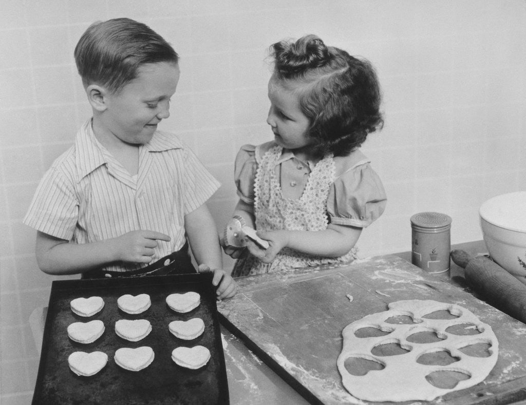 Product images of Young smiling girl and boy baking heart shaped valentine cookies