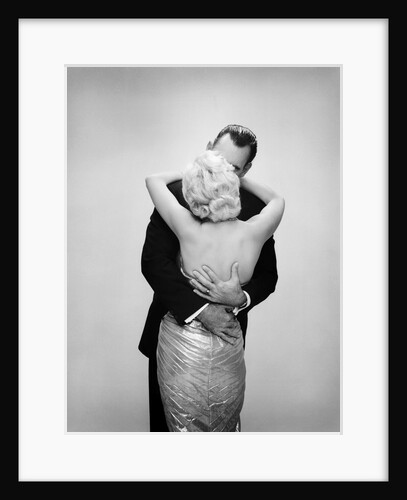 1950s 1960s kissing couple blond woman backless satin evening dress man embracing from behind