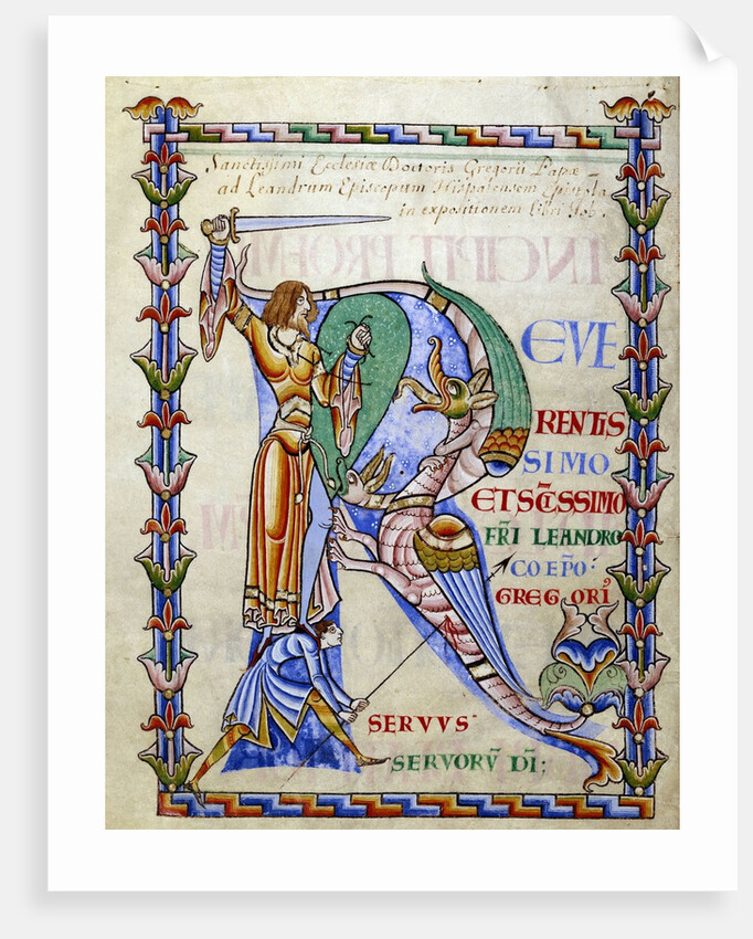Product details Manuscript illumination of knight fighting dragon and illuminated "R"