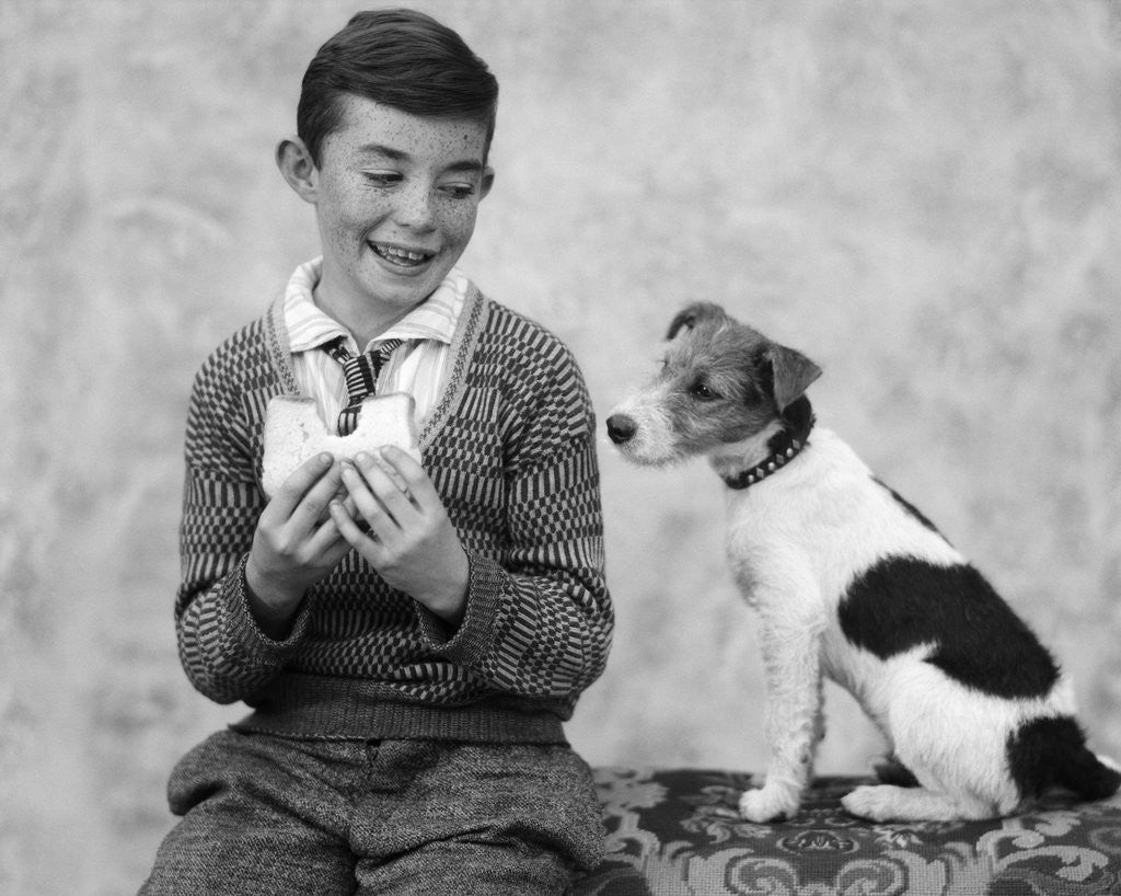 1920s 1930s Boy Eating Sandwich As Dog Stares At Food