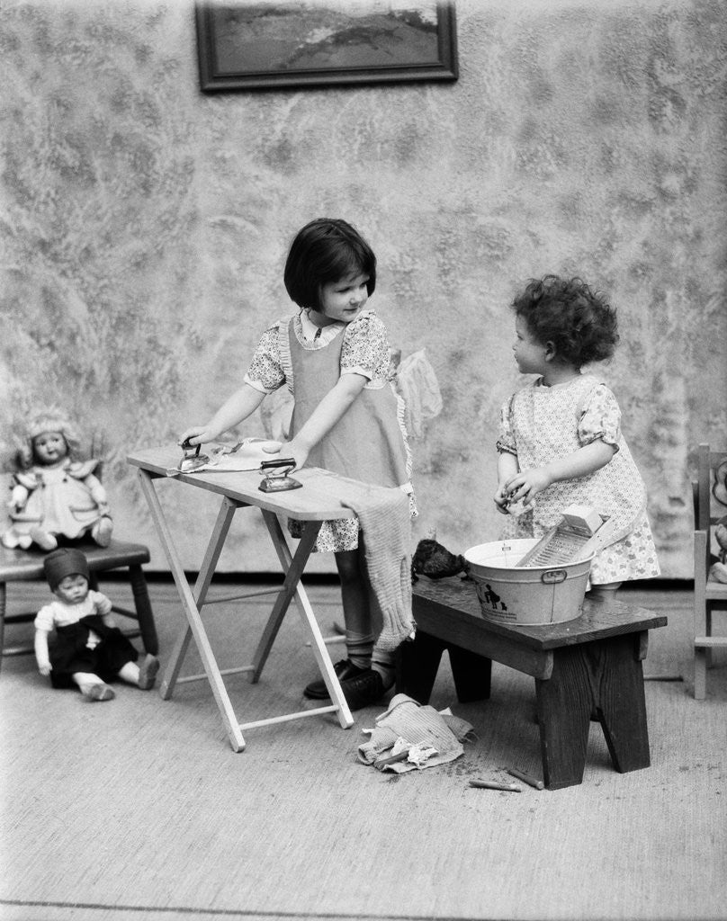 Product images of 1920s two little girls playing ironing washing doll clothes