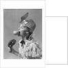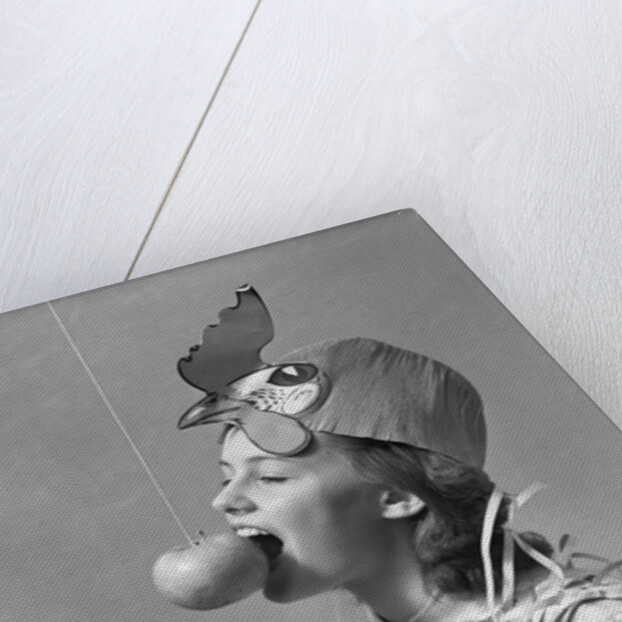Product images of 1930s 1940s girl bobbing for apple dangling on a string wearing party hat and holding eye mask
