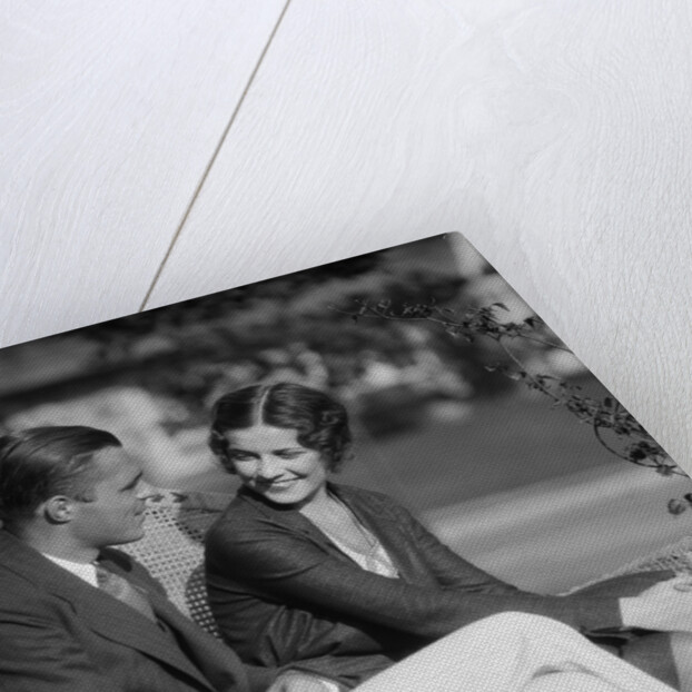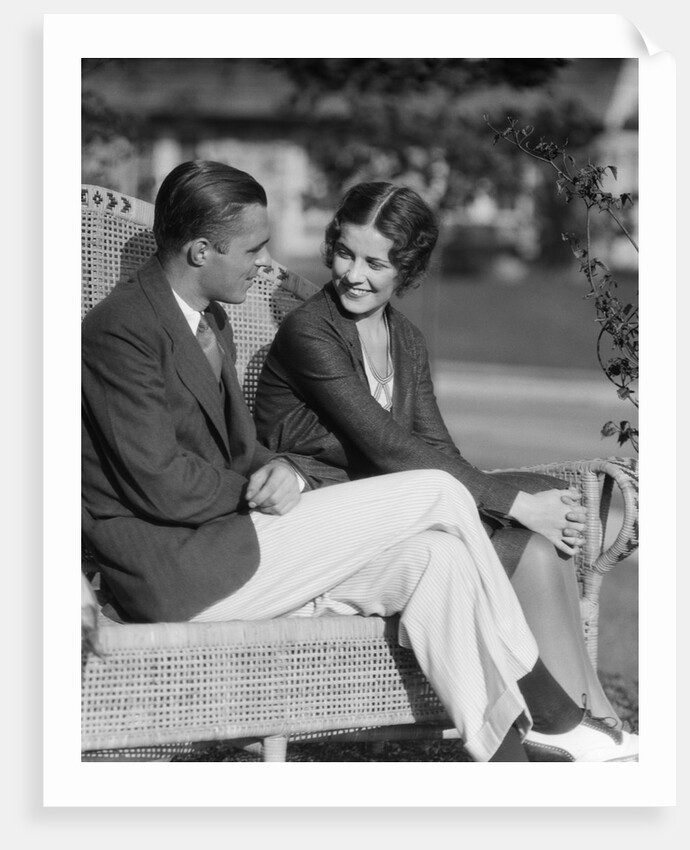 Product details 1930s Couple Sitting Together On Wicker Bench Husband Wife Outdoor