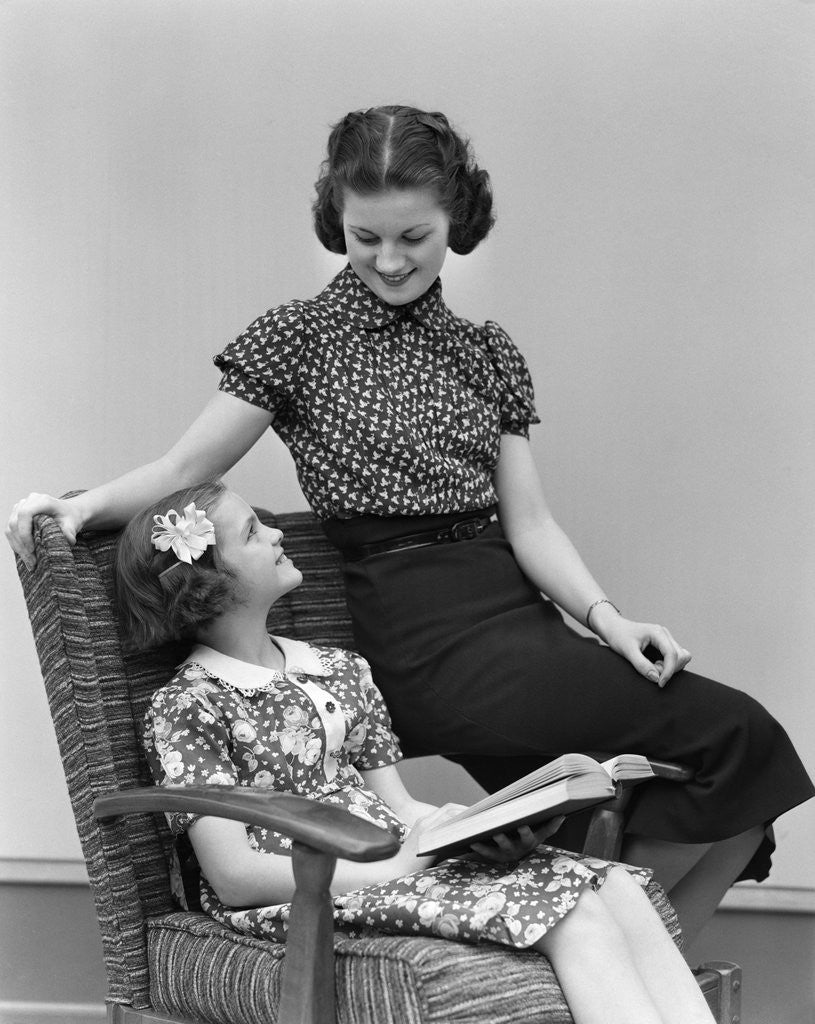 Product images of 1930s Smiling Little Girl Sitting In Chair Reading Looking Up At Woman Older Sister Sitting On Arm Of The Chair