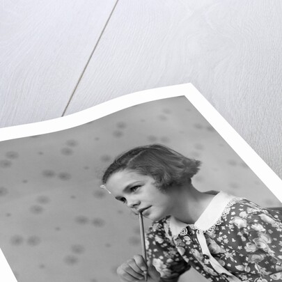 Product images of 1930s Teenage Girl Thinking Sitting At Table Doing Homework