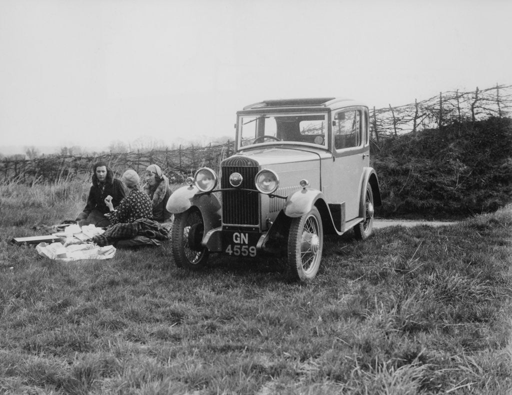 1931 Triumph Scorpion 2-door saloon, (c1930s?). Women picnicking in a field with their Triumph car.