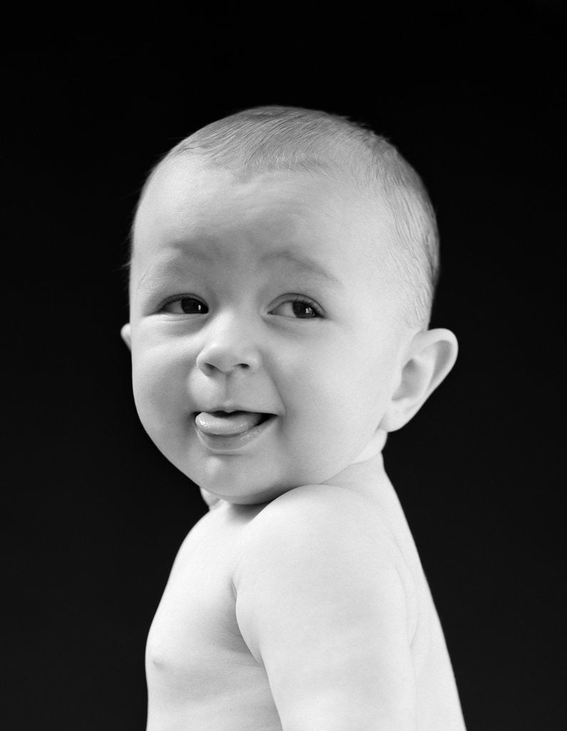 1940s 1950s baby head & shoulders smiling sticking out tongue