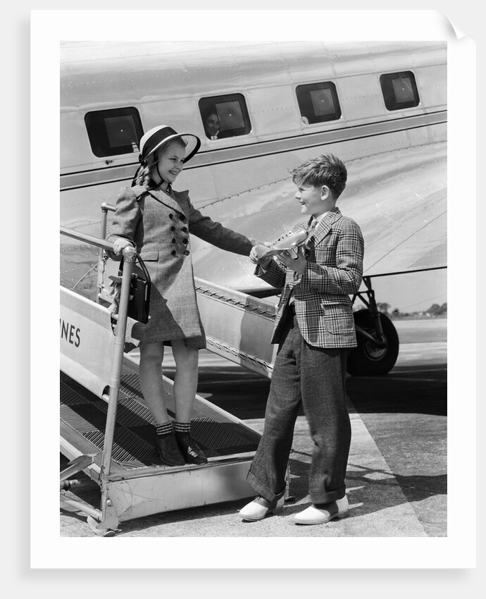 Product details 1940s Boy Girl Walking Off Boarding Ramp Of Airplane Boy Holds Toy Plane Dress Fashion Suit Tie