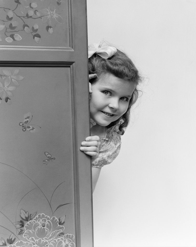 Product details 1940s child smiling little girl peeking around painted folding screen