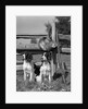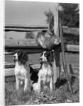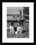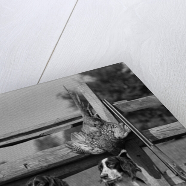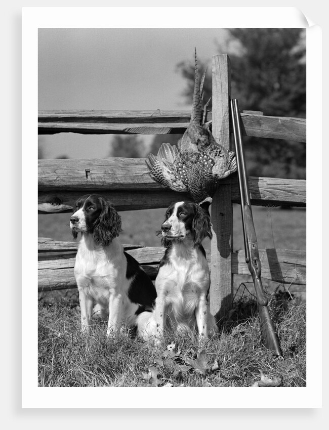 Product images of 1940s pair of english springer spaniels sitting in front of post & rail fence next to shotgun and dead pheasant