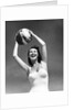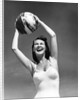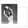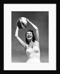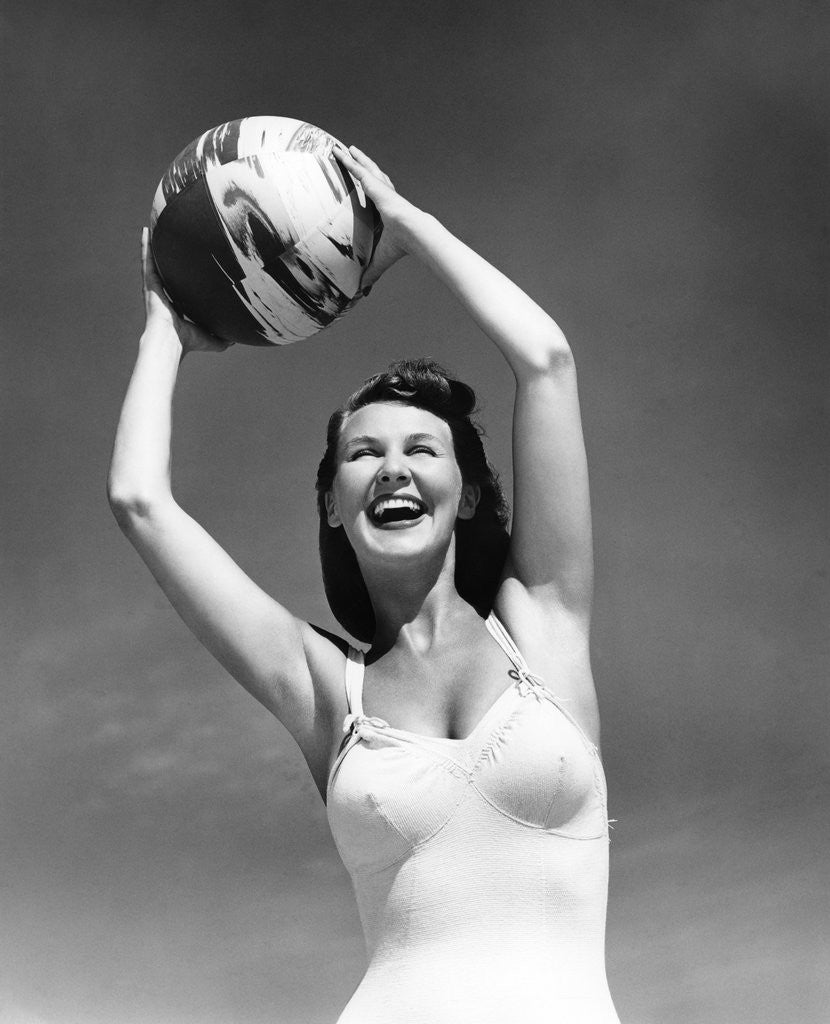 Product images of 1940s Woman In White Bathing Suit Holding A Beach Ball Over Her Head Outdoor