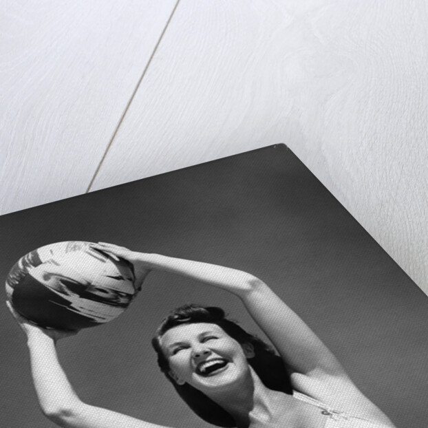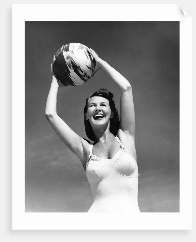 Product details 1940s Woman In White Bathing Suit Holding A Beach Ball Over Her Head Outdoor