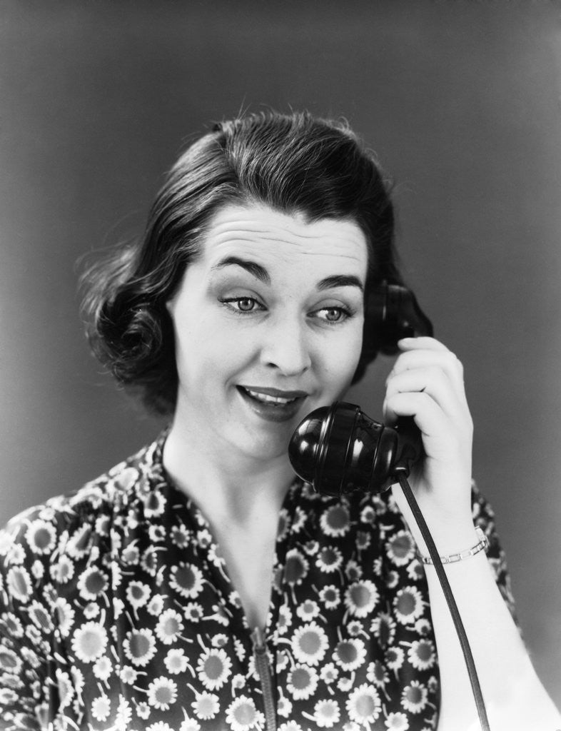 Product images of 1940s woman sunflower print dress talking on telephone smiling