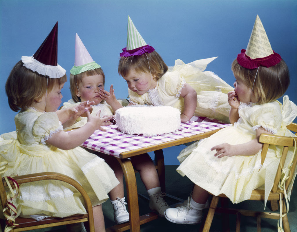 Product images of 1950s 1960s quadruplets 4 red haired girls wearing party hats and dresses sitting table birthday cake