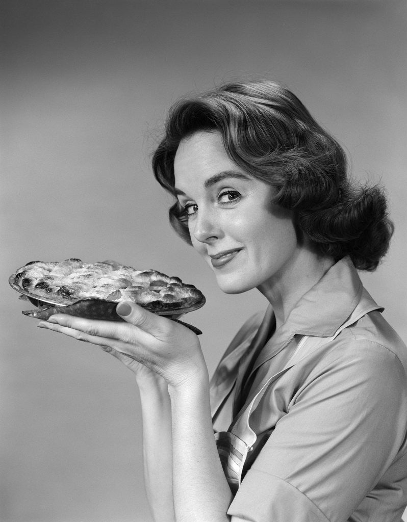 Product images of 1950s 1960s woman smiling holding freshly baked pie looking at camera