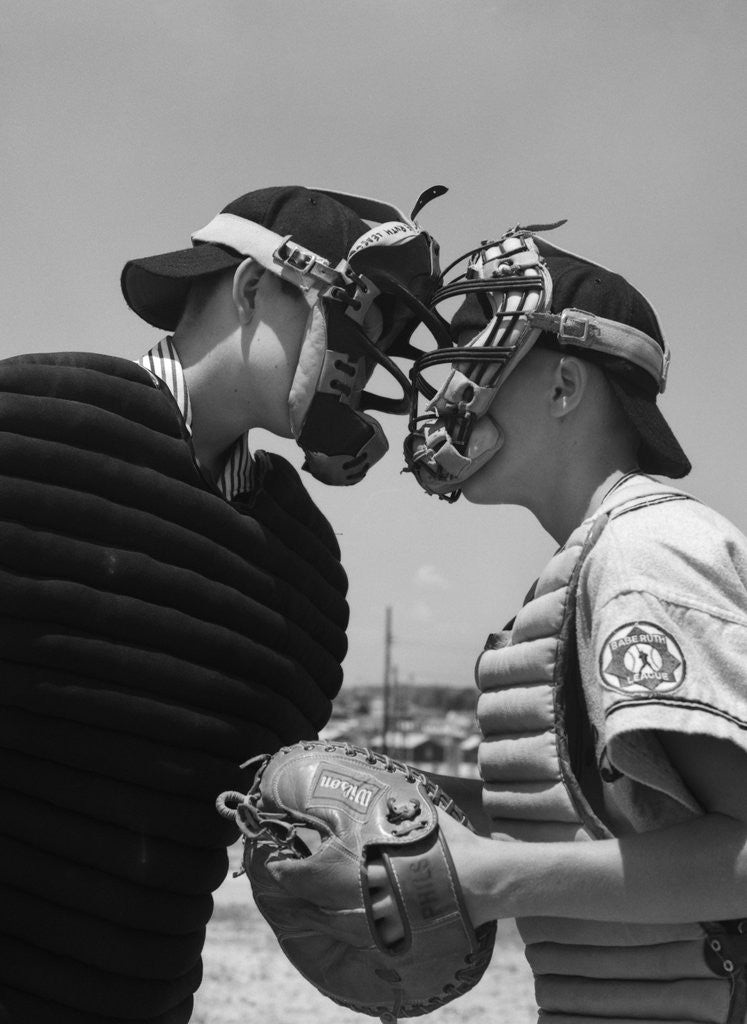 1950s boys in baseball uniforms face to face arguing umpire & catcher
