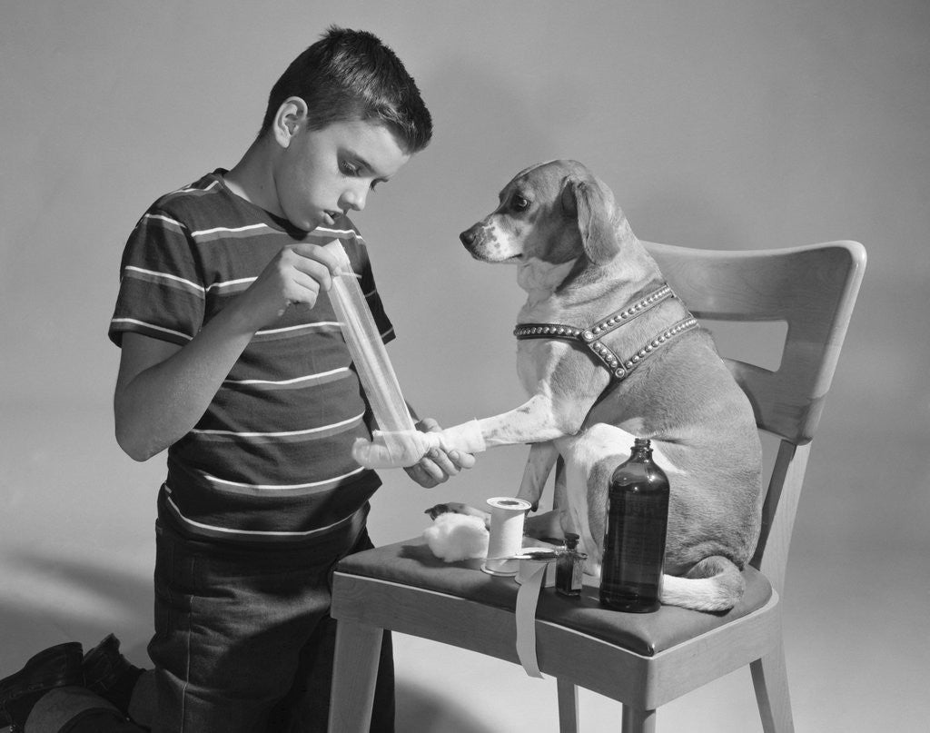 Product images of 1950s dog on chair with paw being bandaged by boy