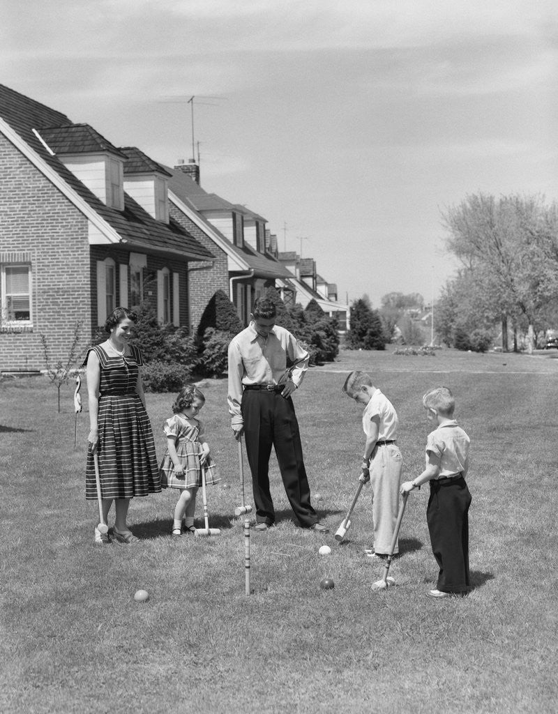 1950s family mother father 3 children playing croquet front lawn suburban home