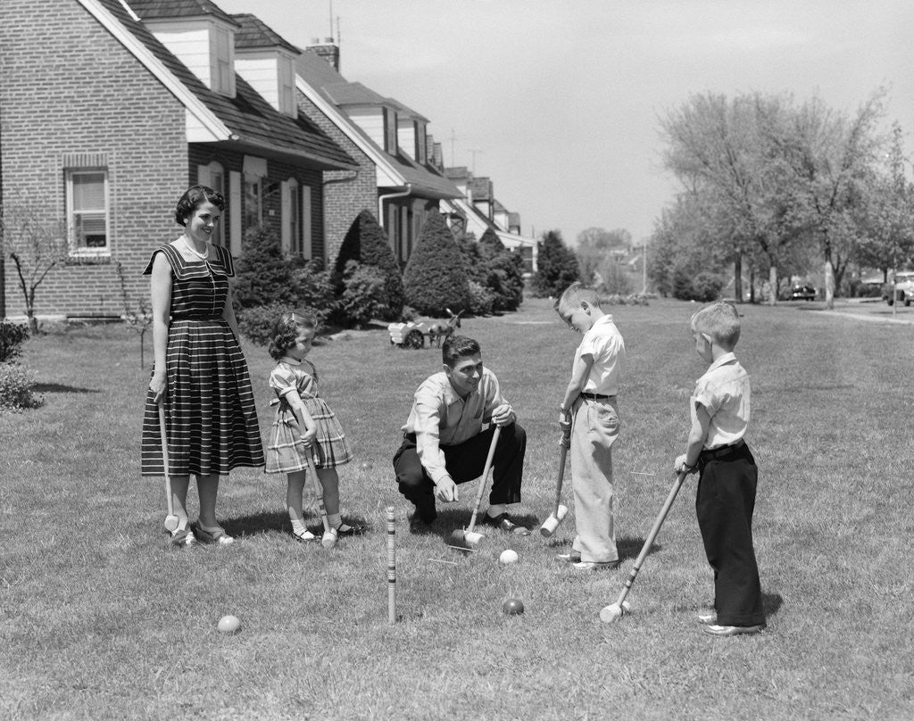 Product details 1950s family mother father 3 children playing croquet front lawn suburban home