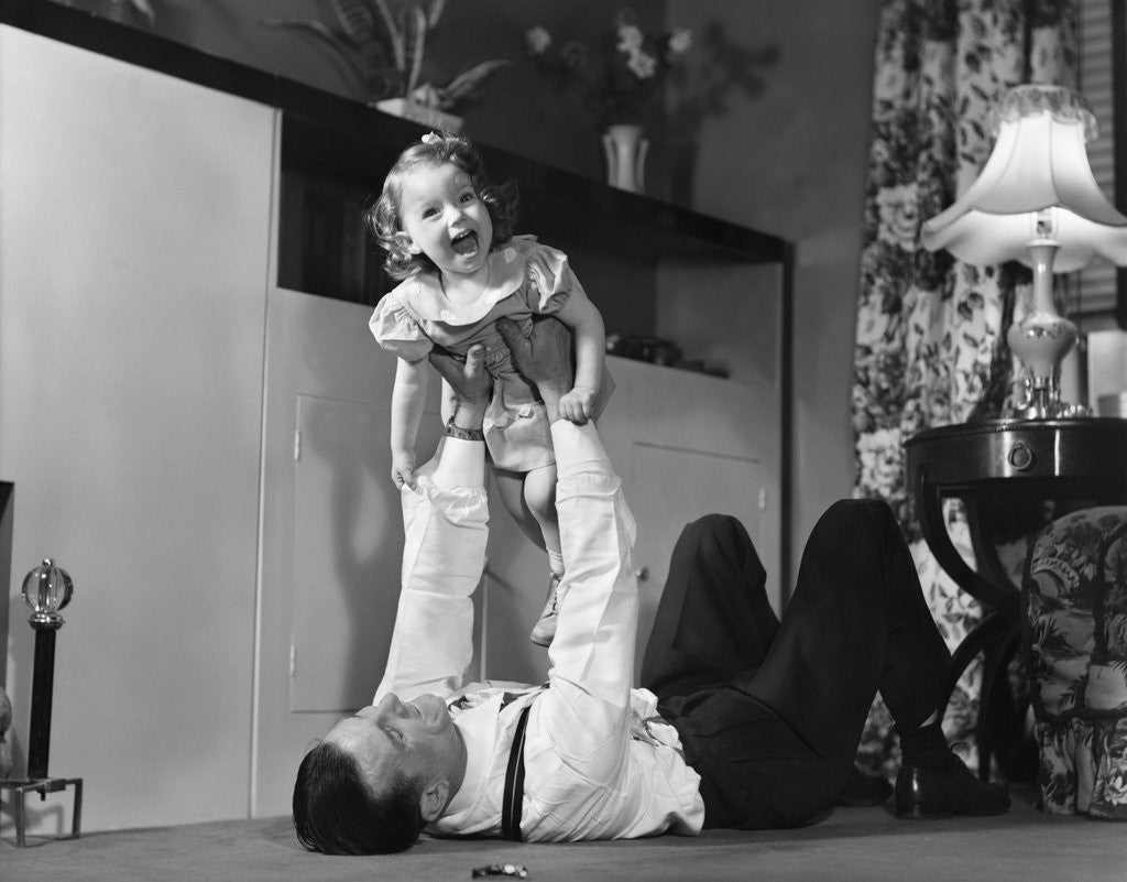 Product images of 1950s father lying floor holding daughter girl up in the air