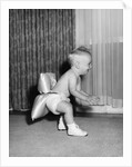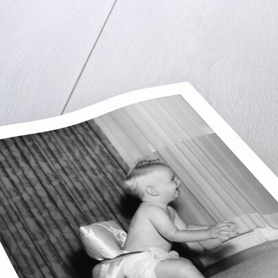 Product details 1950s laughing baby in diaper and shoes learning to walk with a pillow tied to his rear end