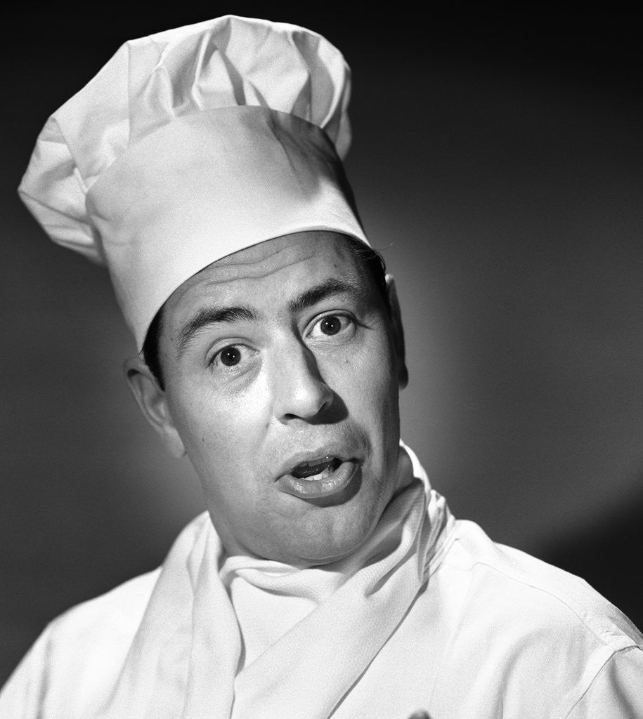 Product images of 1950s portrait man chef humorous expression looking at camera