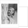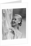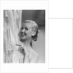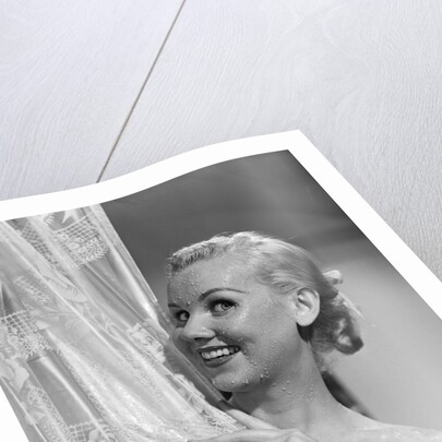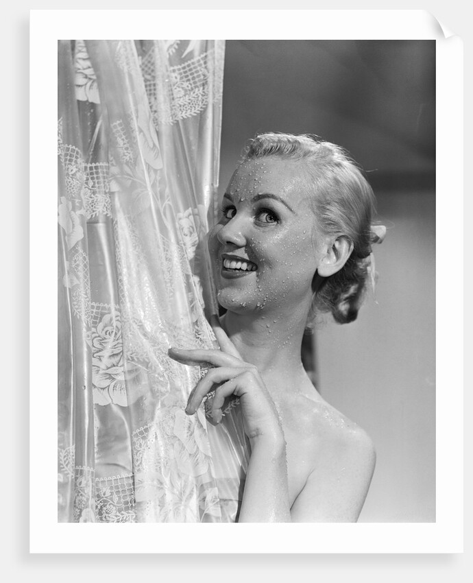 Product images of 1950s portrait of wet blonde peeking around shower curtain