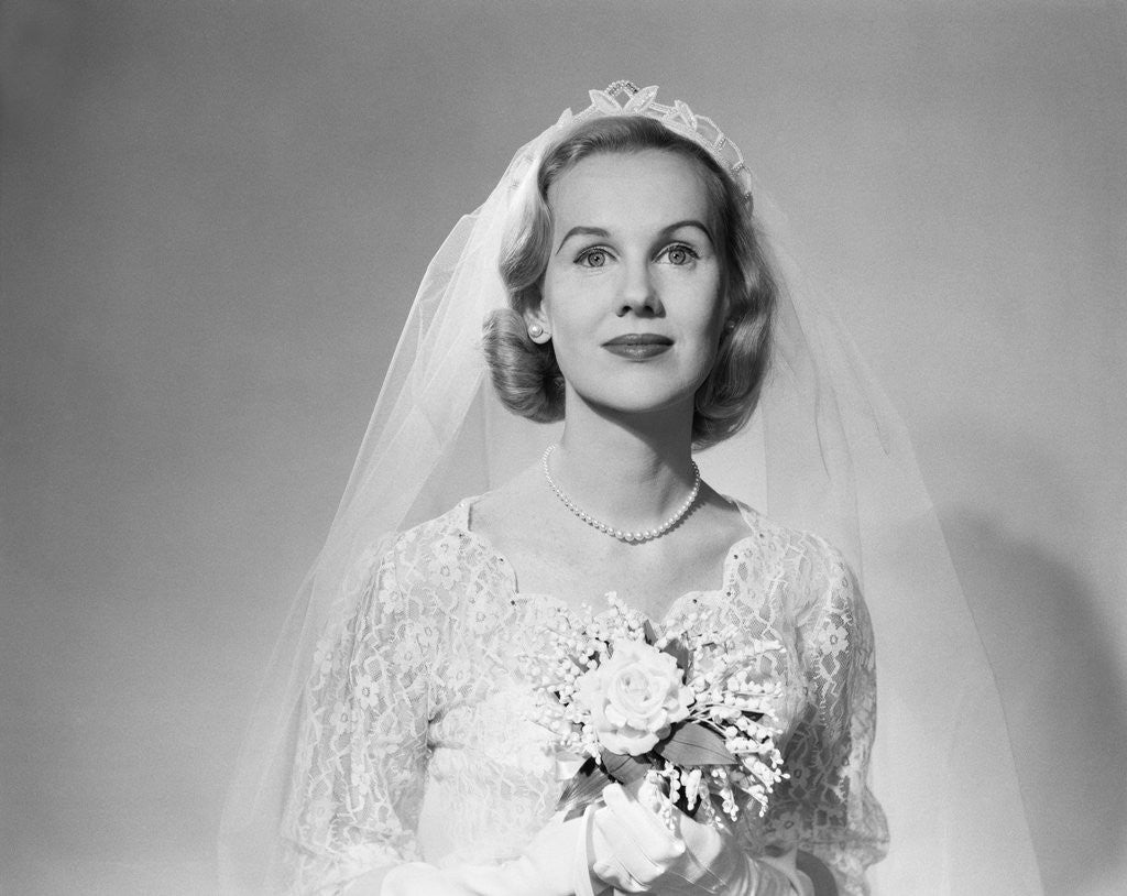 1950s portrait of woman bride wearing white wedding dress veil string of pearls holding a bouquet of flowers looking at camera