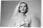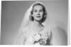 Product images of 1950s portrait of woman bride wearing white wedding dress veil string of pearls holding a bouquet of flowers looking at camera