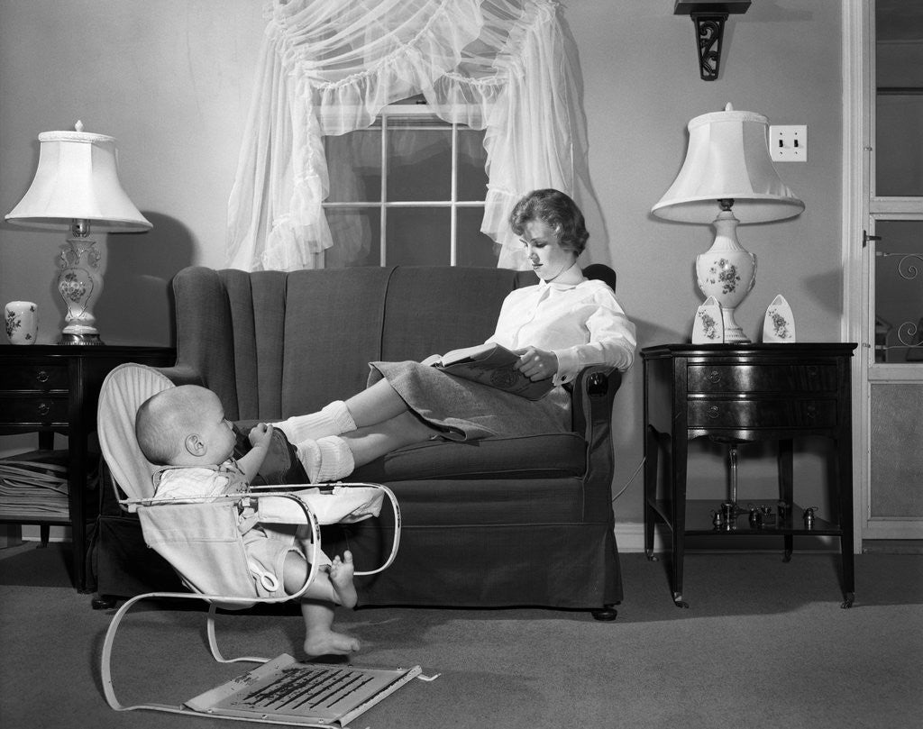 Product details 1950s teen babysitter seated on sofa reading schoolbook while baby in bouncy sling chair grabs her propped up foot