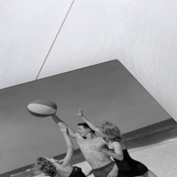 Product images of 1950s teens jumping for beach ball wearing swim suits