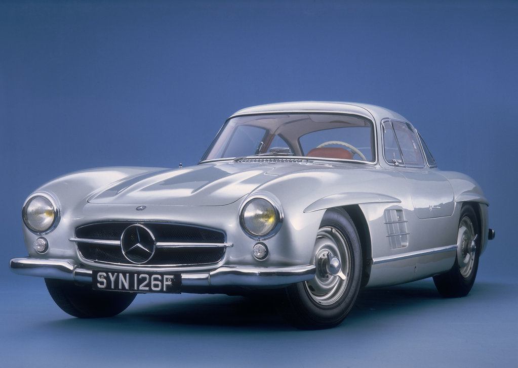 1957 Mercedes Benz 300 SL Gullwing. Mercedes introduced the 300SL, its most famous and dramatic post-war model in 1954. It was a road version of a successful racing car which featured a 3 litre, fuel injected engine capable of a top speed of 140 mph. The outstanding feature of the car was its 'Gullwing' doors. The driver and passenger doors were hinged in the centre of the roof and opened upwards. Production of the 300 SL Gullwing stopped in 1957 after 1400 examples had been made.
