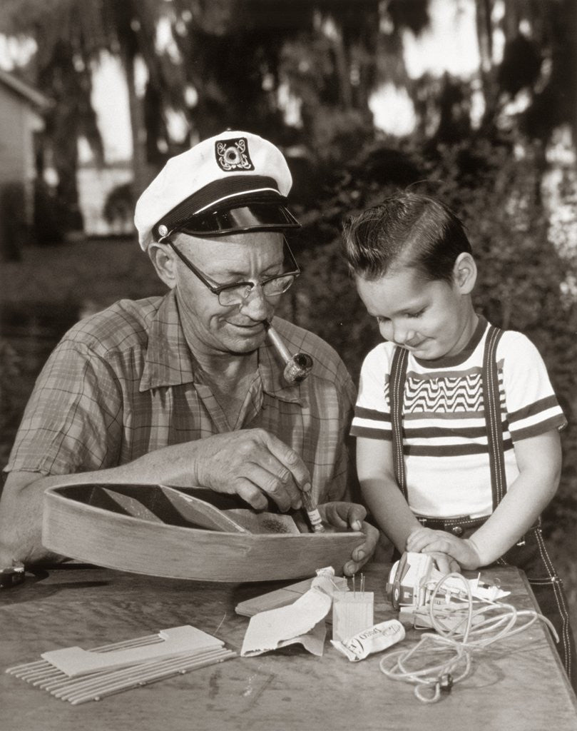 Product details 1960s 1950s Young Boy With Smiling Grandfather Building Model Boat