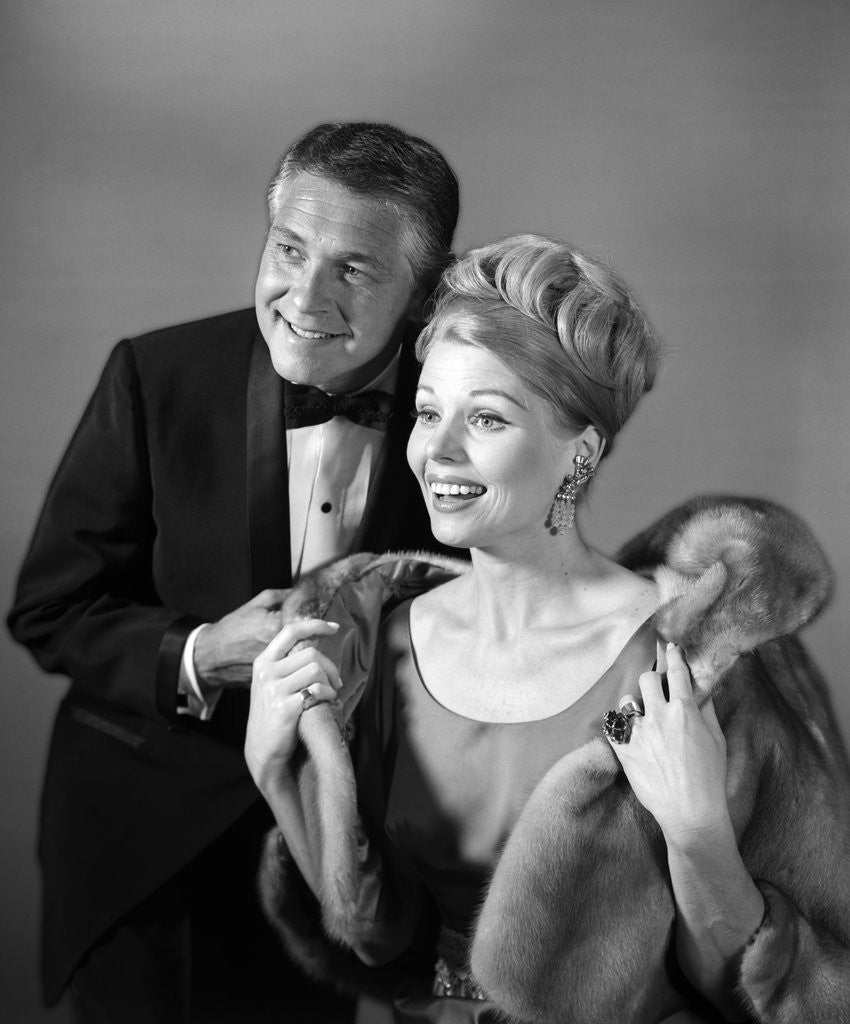 Product images of 1960s 1970s couple in evening wear man in tuxedo woman in fur coat