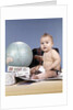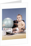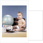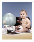 Product images of 1960s Baby Boy Sitting By World Globe With Suitcase And Travel Paraphernalia Looking At Camera
