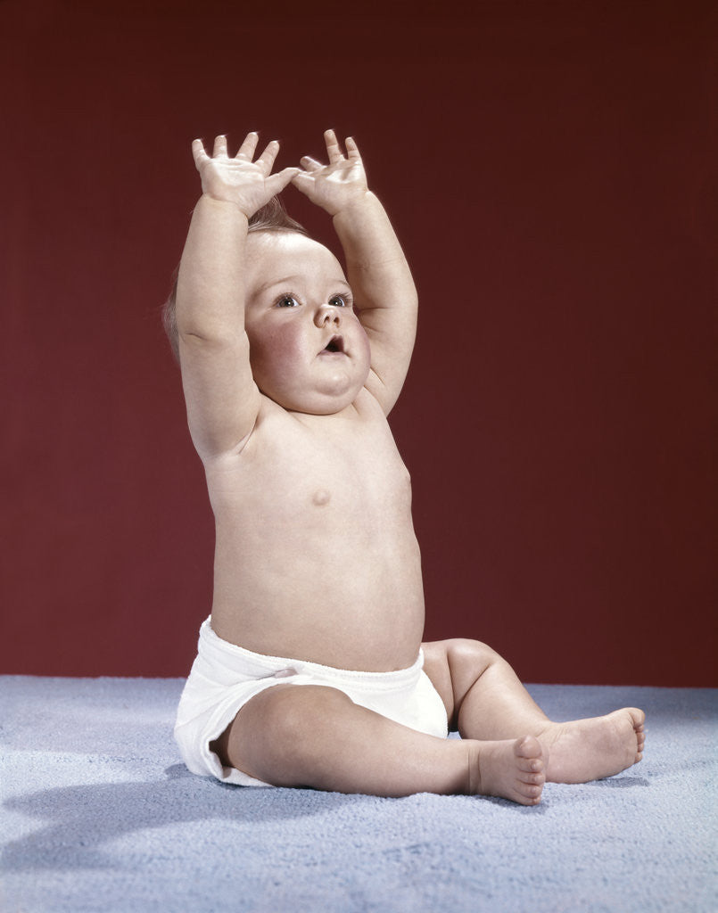 1960s baby wearing cloth diaper sitting arms raised over head